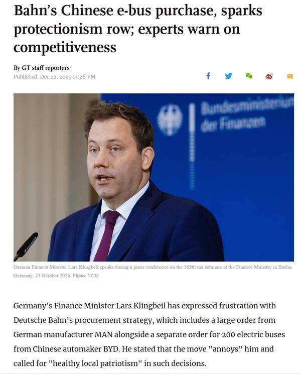 就在几周前,德国政府还呼吁企业展现更多对德国制造的爱国态度。“像德国铁路这样的国有企业,现在计划从中国购买电动公交,听起来简直是个笑话。”针对克林拜尔的言论,有中方专家指出,这是典型的贸易保护主义,只会人为制造 “技术孤岛”,进一步削弱德国制造商在全球市场的竞争力。此外,涉事的比亚迪巴士并非从中国进口,而是在欧盟成员国匈牙利本土生产。“若按照德国财长的逻辑,这难道不构成对中国企业海外投资的歧视吗?”(快科技)
